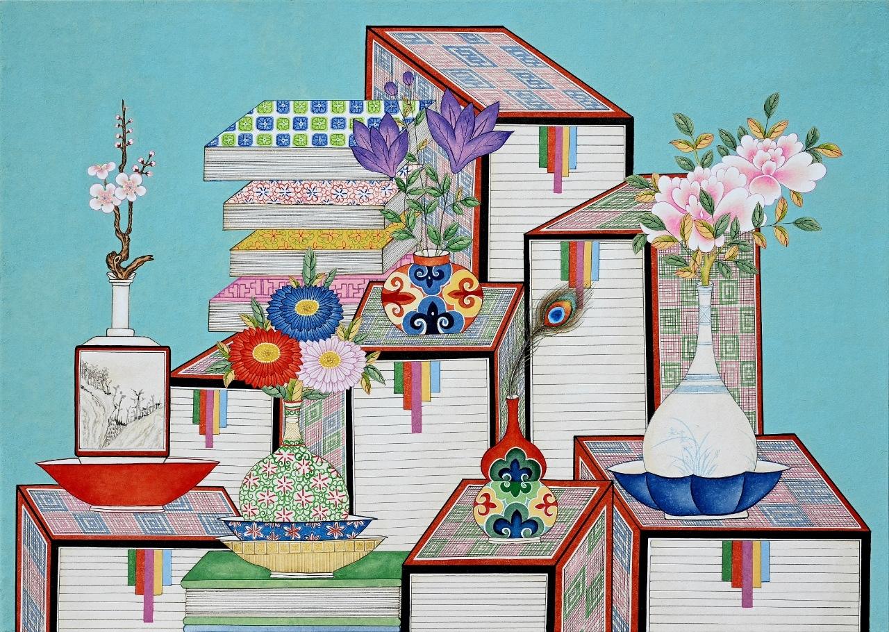El estilo particular de minhwa que presenta “Leer mil libros, caminar mil leguas” se llama chaekgado y hace referencia a una temática característica en la decoración de espacios de estudio, ya que combina imágenes de libros, pinceles, papeles y tinta, simbolizando el entusiasmo por el conocimiento, la búsqueda de sabiduría y el camino hacia un futuro próspero. “Leer mil libros, caminar mil leguas” busca difundir la belleza de la cultura y la apreciación del arte coreano. Las obras, realizadas por autores contemporáneos, presentan una estética única en la que confluyen tradición y modernidad. La exposición está montada en dos salas. En la primera, denominada “Naturaleza y libros, encuentros en un viaje al corazón”, los visitantes podrán apreciar el espíritu de los antiguos eruditos, cuyo estilo combinaba naturaleza muerta y libros en una demostración de complejidad visual y estructura minuciosa. La segunda sala, “Libros y viajes, la creación de nuevos mundos”, presenta obras contemporáneas que reinterpretan el chaekgado tradicional desde nuevas perspectivas. Estas piezas trascienden las reglas formales del género, ofreciendo visiones renovadas e imaginativas del mundo ideal. Además, el espacio alberga artículos inspirados en imágenes de minhwa, los cuales exhiben cómo el arte tradicional coreano se transforma y se integra en el diseño contemporáneo y la vida cotidiana.