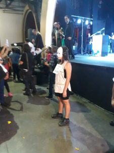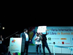 La situación se fue de las manos de los organizadores ya que el grupo no se retiró de la sala a pesar de los pedidos del presidente de la Fundación El Libro, Martín Gremmelspacher. Después del corte de cinta – sin la presencia de los dos ministros – hubo una performance protestataria. Claudia Piñeiro, que sí pudo leer su esperado discurso (al igual que Gremmelspacher), tranquilizó por un momento a los contestatarios al declarar: «Yo estudié en un profesorado de la ciudad, el de matemáticas, y también pido que se retire el proyecto». Vestida de verde en apoyo al proyecto de ley para el aborto legal, seguro y gratuito, retomó en su discurso las palabras de Graham Greene para afirmar que «el lugar del escritor es el lugar del conflicto con la autoridad». Leé el discurso completo de Claudia Piñeiro en Revista Anfibia.